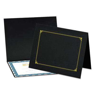 This premium document cover provides an elegant touch to any certificate or award presentation. The heavy-duty cover features a linen textured finish and a gold foil border design for a classic and elegant look. Includes die-cut tabbing to hold 8.5" x 11", 8" x 10" and A4 certificates. Includes link to create custom award certificates. Overall size is 12 1/2" x 9 3/4". Color(s): Black; Width: 9 3/4"; Height: 12 1/2"; Insert Size: 8 1/2 x 11; 8 x 10; A4.